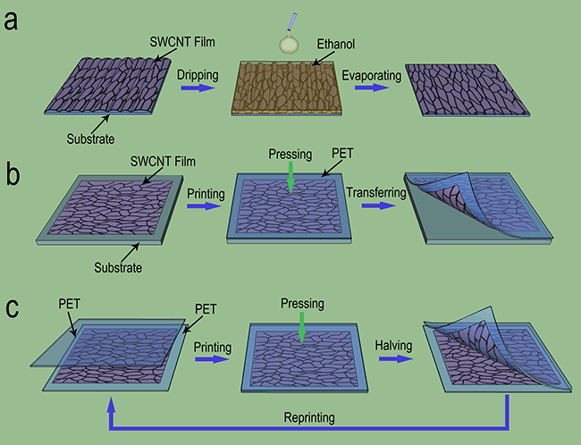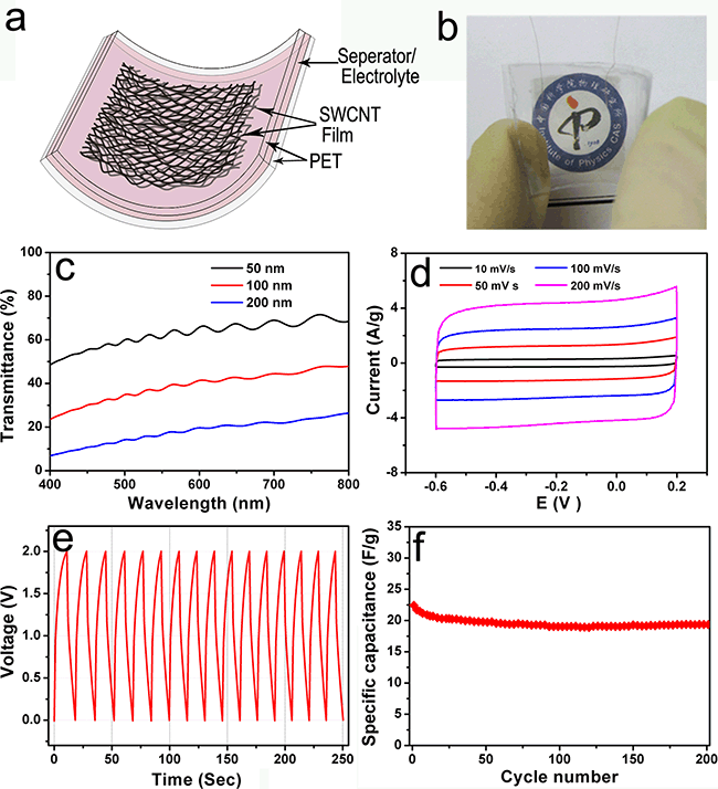 碳納米管透明薄膜是替代氧化銦錫(ITO)導電薄膜的理想材料,更重要的是有望廣泛地應(yīng)用于柔性電子器件。利用浮動催化法直接制備的自支撐碳納米管薄膜具有獨特的二維連續(xù)網(wǎng)絡(luò)結(jié)構(gòu),從而具有優(yōu)異的電學和力學性能(Nano. Lett. 2007, 7, 2307)。但是由于受其制備條件的約束,小于100 納米的自支撐透明導電薄膜難以利用此方法直接來獲得,這限制了其進一步的應(yīng)用。為了解決這一問題,他們發(fā)展了傳統(tǒng)的轉(zhuǎn)移印刷技術(shù),提出了一種基于靜電吸附的減薄碳納米管薄膜的方法——重復轉(zhuǎn)移印刷法,通過利用離子靜電吸附效應(yīng)提高低表面能基底的表面能,使得碳納米管薄膜可以從高表面能的基底轉(zhuǎn)移到原本表面能較低的基底上。結(jié)合具有特殊二維網(wǎng)絡(luò)結(jié)構(gòu)的碳納米管薄膜與靜電吸附重復轉(zhuǎn)移印刷法,可在PET襯底上得到不同厚度甚至近于亞單層的超薄碳納米管薄膜,透明度可達90%以上。此方法不僅可以有效提高碳納米管的利用率,保持碳納米管薄膜的結(jié)構(gòu),還可以有效提高超薄碳納米管薄膜的制備效率,簡化了實驗過程。該方法正在申請中國發(fā)明專利(201210270061.0)?;谒苽涞某√技{米管薄膜,研究人員組裝了柔性透明碳納米管薄膜超級電容器,超級電容器表現(xiàn)出了一定的透光性和良好的電化學性能。相關(guān)研究結(jié)果發(fā)表在Small (DOI: 10.1002/smll.201201587)上,并得到編輯的較高評價。