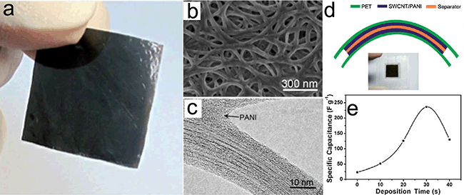 碳納米管薄膜具有高導電性和多孔結(jié)構(gòu),可以直接作為超級電容器的電極材料,但是由于碳納米管薄膜中的碳納米管一般是以管束的形式存在,管束內(nèi)部空隙尺寸在0.4 nm以下,電解液離子根本無法進入管束內(nèi)部的空隙,因此管束內(nèi)部碳納米管的表面對雙電層電容沒有貢獻,致使其有效比表面積大大減小,比電容較小。在碳納米管表面包覆導電聚合物,引進贗電容是提高碳納米管電極比電容的一種有效途徑。但是低電導率導電聚合物的加入導致碳納米管/導電聚合物異質(zhì)結(jié)構(gòu)電極的導電率與碳納米管相比會嚴重下降,影響超級電容器的功率密度。如何在利用導電聚合物提高能量密度的同時不降低超級電容器功率密度,是目前碳納米管/導電聚合物異質(zhì)電極制備的一個難題。他們以直接生長的自支撐碳納米管薄膜作為模板,利用電沉積的方法成功制備出了“骨架/皮膚”型的碳納米管/聚苯胺異質(zhì)結(jié)構(gòu)薄膜。在這種異質(zhì)結(jié)構(gòu)薄膜中,聚苯胺均勻包覆碳納米管薄膜中的碳管管束,碳管管束仍然保持良好的連續(xù)網(wǎng)絡(luò)結(jié)構(gòu),形成新的“骨架/皮膚”型碳納米管/聚苯胺異質(zhì)連續(xù)網(wǎng)格結(jié)構(gòu),確保異質(zhì)結(jié)構(gòu)薄膜具有高導電性。此結(jié)構(gòu)既充分發(fā)揮了碳納米管的高導電性,又發(fā)揮了導電聚合物贗電容的優(yōu)勢。獨立無支撐的碳納米管/聚苯胺異質(zhì)結(jié)構(gòu)薄膜具有非常好的力學性質(zhì),可以作為柔性超級電容器電極。與直接生長的碳納米管薄膜電極相比,基于碳納米管/聚苯胺異質(zhì)結(jié)構(gòu)薄膜的超級電容器電極的比電容提高了近一個數(shù)量級,并且在提高電極電流密度的同時,也保證其具有較高的功率密度。相關(guān)研究結(jié)果發(fā)表在Energy & Environmental Science(2012, 5, 8726)上,被編輯部選為Hot Paper進行了介紹,Chemistry World也以Skeleton and skin strategy improves supercapacitor為題進行了專門報道。