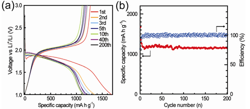 研究發(fā)現(xiàn),這種鏈狀小硫分子S2-4在嵌/脫鋰過程中表現(xiàn)出與環(huán)狀S8分子截然不同的電化學(xué)行為,在充放電過程中不會(huì)再形成溶解性多硫離子(Li2S8、Li2S6、Li2S4),從而從根本上徹底解決了傳統(tǒng)硫正極材料由于多硫離子溶出導(dǎo)致循環(huán)性能差的難題。同時(shí),由于硫顆粒的尺寸已降至分子級(jí),使硫的電化學(xué)活性顯著提高。這種基于納米孔道限域效應(yīng)的非常規(guī)硫分子/碳復(fù)合正極材料在鋰-硫電池中表現(xiàn)出很高的比容量、優(yōu)異的循環(huán)穩(wěn)定性及高倍率性能。以硫質(zhì)量計(jì)算的首圈放電容量達(dá)1670mA h/g,接近硫的理論容量(1675mA h/g),200圈循環(huán)后仍有1150mA h/g??臻g限域的鏈狀小硫分子及其特殊電化學(xué)性質(zhì)的發(fā)現(xiàn),對(duì)于根本解決硫正極的多硫離子溶出問題,開發(fā)高性能鋰-硫電池具有重要意義。相關(guān)結(jié)果已申請(qǐng)三項(xiàng)PCT國(guó)際專利。