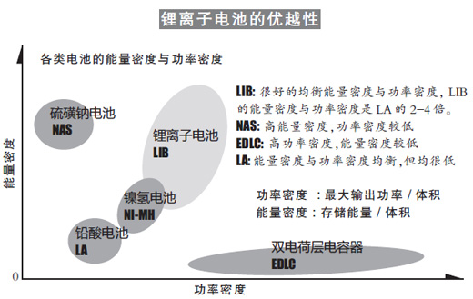 在數(shù)百年的發(fā)展歷程中,蓄電池走過了鉛酸電池、鎳鎘電池等階段,在這一過程中,由于不可避免的“記憶效應(yīng)”問題、能量密度較低以及環(huán)保方面的考慮,上述電池的發(fā)展受到制約。與此同時(shí),具有高密度、無“記憶效應(yīng)”、轉(zhuǎn)換效率高、重量輕、壽命長、無污染等優(yōu)點(diǎn)的鋰離子電池脫穎而出。鋰離子電池是電極使用鋰材料的充電電池,蓄電能力是鉛酸電池的3至4倍,是混合動力車用鎳氫蓄電池的兩倍。在鋰離子電池的基礎(chǔ)上,又進(jìn)一步發(fā)展出多種鋰聚合物電池。
