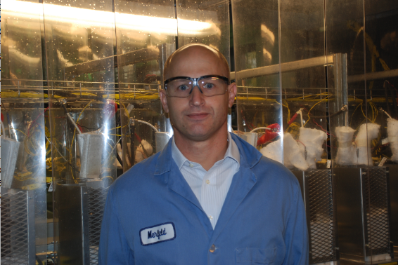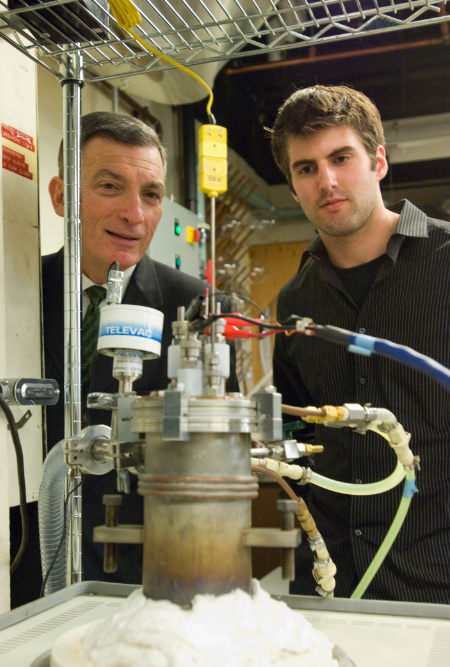 唐納德·山德維教授和材料加工中心研究聯(lián)盟的大衛(wèi)·布拉德韋爾在實驗室里觀察一塊小型測試電池。電池內(nèi)部中心是一塊高度絕緣的金屬圓筒,它可以將電池加熱到700℃(攝影:Patrick Gillooly)