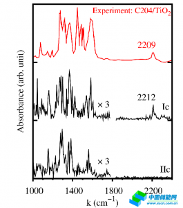 他們進(jìn)一步研究了不含金屬的純有機分子在TiO2界面上的原子結(jié)構(gòu)對形成的有機染料太陽能電池效率的影響。這類分子一般采納Donor-π-Acceptor的結(jié)構(gòu),大多通過氰基丙烯(cyanoacrylic) 基團與表面結(jié)合。雖然這一類分子得到極為廣泛的應(yīng)用,但其吸附結(jié)構(gòu)并不清楚。此前人們普遍認(rèn)為這一類有機染料與傳統(tǒng)釕復(fù)合物染料類似,只通過羧基吸附在TiO2表面?;诘谝恍栽矸肿觿恿W(xué)和含時密度泛函理論計算,焦揚等與瑞士聯(lián)邦理工Michael Graetzel教授合作研究了含氰基丙烯基團的有機分子在銳鈦礦TiO2(101)表面的吸附和電子動力學(xué)(圖1)。通過對動力學(xué)模擬得到的振動譜的詳細(xì)分析和與實驗得到的紅外吸收譜的比較(圖2),他們發(fā)現(xiàn)氰基和羧基共同參與表面吸附,該吸附構(gòu)型非常有利于太陽能源轉(zhuǎn)化。