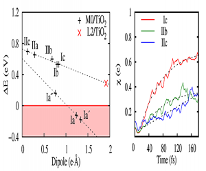 計算結(jié)果表明這種新提出的通過氰基和羧基共吸附、含有Ti-N鍵的表面構(gòu)型在能量上最穩(wěn)定(圖1)。這改變了人們的普遍認(rèn)識:氰基在吸附中起到關(guān)鍵作用,它對界面穩(wěn)定性、電化學(xué)性質(zhì)的影響往往被忽視。通過電子結(jié)構(gòu)計算和激發(fā)態(tài)電子動力學(xué)模擬,他們進(jìn)一步研究了這種新提出的吸附構(gòu)型中染料分子和表面的電子耦合,能級相對位置,以及它們對太陽能電池電壓及電流的影響。光激發(fā)電子從染料分子向TiO2表面注入的動態(tài)過程表明新構(gòu)型有利于電子的快速注入并有著高量子效率,在電子結(jié)構(gòu)上則更有利于產(chǎn)生較高的工作電壓(圖3),從而保證此類太陽能電池具有較高的能量轉(zhuǎn)化效率(~10%)。這些工作在原子尺度上建立了界面能源轉(zhuǎn)化機制中微觀結(jié)構(gòu)與宏觀性能的關(guān)系,對進(jìn)一步從微觀上調(diào)控、優(yōu)化和提高太陽能轉(zhuǎn)化效率提供了新的辦法。相關(guān)結(jié)果發(fā)表在【Advanced Functional Materials(IF=10),DOI: 10.1002/adfm.201201831】上。