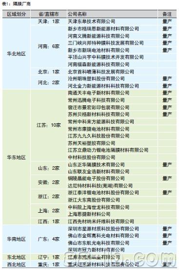 隨著鋰離子電池產(chǎn)業(yè)的快速發(fā)展,我國(guó)鋰電池隔膜產(chǎn)量逐漸增長(zhǎng)。由于利潤(rùn)率較高,大概在20%左右,吸引了越來(lái)越多的企業(yè)進(jìn)入鋰離子電池隔膜領(lǐng)域。據(jù)高工鋰電產(chǎn)業(yè)研究所(GBII)統(tǒng)計(jì),國(guó)內(nèi)共有35家隔膜生產(chǎn)廠商,其中18家已經(jīng)量產(chǎn),占總數(shù)的51.43%。從區(qū)域劃分的角度來(lái)看,華東地區(qū)共有1 9家廠商,占總數(shù)的54%;華北地區(qū)共有10家廠商,占總數(shù)的29%;華南地區(qū)共有4家廠商,占總數(shù)的11%;東北和西北地區(qū)分別有1家廠商。珠三角、長(zhǎng)三角和華北地區(qū)實(shí)現(xiàn)規(guī)模產(chǎn)業(yè)化的企業(yè)數(shù)量較為集中,結(jié)合鋰電池終端產(chǎn)品企業(yè)的地域分布,未來(lái)鋰電池隔膜行業(yè)有望在上述三個(gè)地區(qū)形成產(chǎn)業(yè)集群。具體隔膜企業(yè)名稱如表1所示。