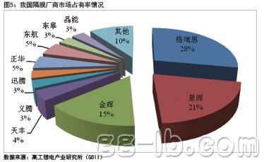 隨著南通天豐、河南義騰、山東正華和佛山東航等廠家產(chǎn)能逐漸釋放,相比于2011年,2012年的市場(chǎng)格局已經(jīng)發(fā)生了一定變化。從企業(yè)的占有率來(lái)看,他們占有率依次是:新鄉(xiāng)格瑞恩占28%,深圳星源達(dá)占21%,佛山金輝占15%。具體占有率如圖5所示。