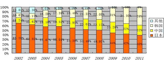 截止2011年,在正極材料的市場(chǎng)主要是由日本、中國(guó)所占領(lǐng)。從2011年開(kāi)始,韓國(guó)號(hào)召本土企業(yè)大力發(fā)展正極材料的生產(chǎn),希望通過(guò)本土企業(yè)的一條龍的產(chǎn)業(yè)鏈發(fā)展來(lái)進(jìn)一步擴(kuò)大其在鋰離子電池以及其衍生產(chǎn)業(yè)的市場(chǎng)份額,因?yàn)轫n國(guó)在電子行業(yè)的優(yōu)勢(shì)近年來(lái)相當(dāng)迅猛,其在電池行業(yè)領(lǐng)域的發(fā)展也被帶動(dòng)起來(lái),如果我國(guó)仍然停留在中低端產(chǎn)品的生產(chǎn)而不尋求高端市場(chǎng)的擴(kuò)張,盡管我國(guó)有低勞動(dòng)力成本優(yōu)勢(shì),但是這只會(huì)讓我國(guó)的正極材料更加被動(dòng),只能依托他國(guó)的產(chǎn)業(yè)鏈發(fā)展,這也是對(duì)我國(guó)的正極材料很致命的,同時(shí)也是我國(guó)本土企業(yè)需要尋求的出路,根據(jù)最新2011年國(guó)內(nèi)最大規(guī)模的鋰離子電池材料綜合供應(yīng)商-杉杉股份的業(yè)績(jī)報(bào)告指出,其正極材料在其所有業(yè)務(wù)中屬于負(fù)增長(zhǎng),主要受業(yè)內(nèi)正極材料投資過(guò)大,產(chǎn)能過(guò)剩,價(jià)格持續(xù)下降,以及正極材料價(jià)格降低所致。從2011年我國(guó)鋰離子電池市場(chǎng)的份額相對(duì)2010年幾乎無(wú)增長(zhǎng),也導(dǎo)致了國(guó)內(nèi)沒(méi)有相應(yīng)的產(chǎn)業(yè)需求量,我國(guó)市場(chǎng)的正極材料市場(chǎng)正處于關(guān)鍵的轉(zhuǎn)型期。