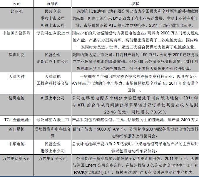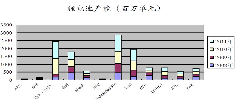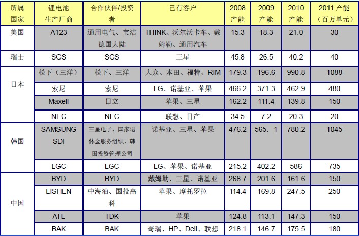 表2:2008-2011全球主要鋰電池生產(chǎn)企業(yè)概況及鋰電池產(chǎn)能(百萬(wàn)單元)