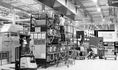 ?、邎D中一名工人正將電池組插入封裝外殼,電池中包含有用于控制電池的微處理器,以及讓電池適應(yīng)在約300℃環(huán)境中仍舊工作的加熱器。