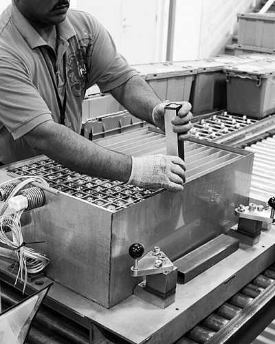 ?、萁酉聛韺⒁獪?zhǔn)備組裝一個(gè)完整的鈉鎳電池。如圖所示,工人在刷導(dǎo)電的碳基涂料,然后將把導(dǎo)電金屬裝置與電極材料在電池封裝之前都安放到位。