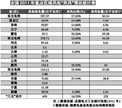 “三北”地區(qū)包括國(guó)家規(guī)劃的6個(gè)以陸地風(fēng)電為主的千萬(wàn)千瓦級(jí)風(fēng)電基地,并網(wǎng)風(fēng)電裝機(jī)占全國(guó)并網(wǎng)風(fēng)電裝機(jī)比重達(dá)87.7%。2011年,全國(guó)風(fēng)電發(fā)電量為731.74億千瓦時(shí),其中“三北”地區(qū)風(fēng)電發(fā)電量為635.37億千瓦時(shí),占比為86.8%。但2011年,“三北”地區(qū)風(fēng)電場(chǎng)平均利用小時(shí)數(shù)1907小時(shí),同比降低266小時(shí);棄風(fēng)電量達(dá)123億千瓦時(shí),棄風(fēng)率約16%,電費(fèi)損失約66億元。