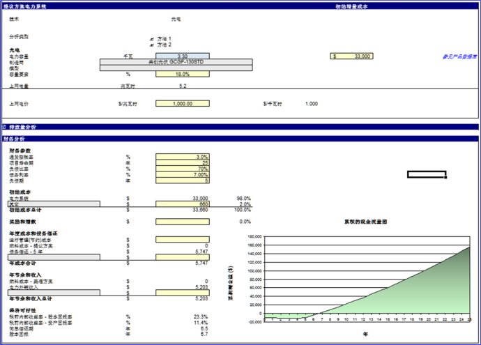 同樣以國(guó)內(nèi)目前用戶側(cè)家庭自發(fā)自用光伏發(fā)電為例,以家庭住宅安裝一個(gè)3.3kW的薄膜電池光伏屋頂或幕墻發(fā)電系統(tǒng)。包含電池模組、系統(tǒng)平衡件BOS(除模組以外的系統(tǒng)平衡件:逆變器、電站監(jiān)控系統(tǒng)、組件支架、高低壓配電、變壓器、電纜等)、和土建施工管理費(fèi)用等,系統(tǒng)成本降到約為12元/W左右。假設(shè)貸款比例70%,負(fù)債5年,通貨膨漲率3%,負(fù)債利率按7%,項(xiàng)目壽命25年,年維護(hù)費(fèi)按2%,不考慮碳排放收入,按現(xiàn)行電價(jià)1元/度電回購制度計(jì)算,投資3.3kW小型家庭光伏發(fā)電系統(tǒng),在陽光充足地區(qū),將可得到12%的資產(chǎn)回報(bào)率,7年回收股本,項(xiàng)目經(jīng)濟(jì)性可行(參見下圖)。