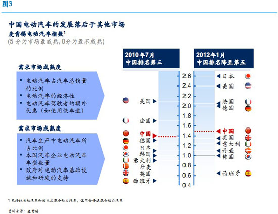 麥肯錫的電動汽車指數(shù)可以被用來衡量一個(gè)國家是否有足夠準(zhǔn)備支持電動汽車產(chǎn)業(yè)。該指數(shù)從供給和需求角度對一個(gè)國家的電動汽車成熟度進(jìn)行評估:根據(jù)本國汽車廠商規(guī)劃的電動汽車產(chǎn)量等指標(biāo)進(jìn)行供給衡量,根據(jù)對車主提供的優(yōu)惠措施和基礎(chǔ)設(shè)施投資水平等指標(biāo)進(jìn)行需求衡量。麥肯錫的電動汽車指數(shù)表明中國在供給和需求的得分都相對較低。而且中國電動汽車整體成熟度從2010年7月的第三位降至2012年2月的第五位,排在日本、美國、法國和德國之后(圖3)。