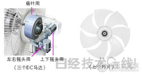 據(jù)稱,DC馬達(dá)由模具樹脂一體成形,葉片的中心部分加入了橡膠以吸收振動(dòng),因此可以減小工作噪聲