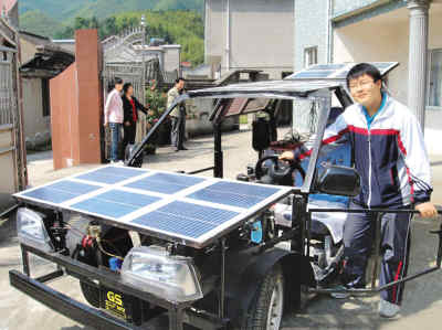 中國儲能網(wǎng)訊:浙江寧波象山技工學校19歲高二學生朱振霖的美夢終于成真。他花1.5萬元,自行研制出一輛太陽能汽車:不需氣、不需油,每天曬曬太陽,能開70公里。