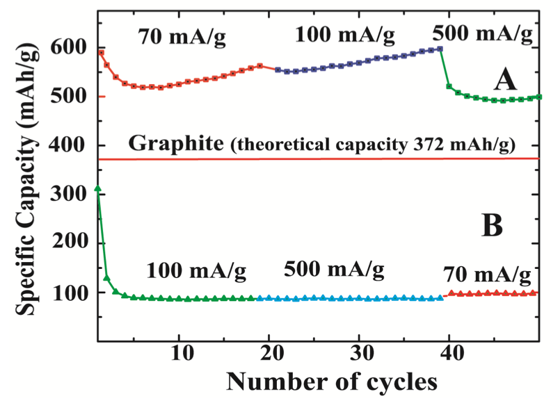 長(zhǎng)期穩(wěn)定的放電容量比:(A)銅涂層氫化非晶硅;(B)原始?xì)浠蔷Ч瑁恢虚g紅線表示石墨的理論存儲(chǔ)容量。來源:得克薩斯大學(xué)