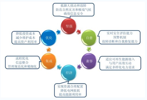 智能電網(wǎng)主要有堅(jiān)強(qiáng)、自愈、兼容、經(jīng)濟(jì)、集成、優(yōu)化等特征。堅(jiān)強(qiáng)的特征表現(xiàn)在能夠抵御大擾動(dòng)和故障、防范自然災(zāi)害和極端氣候、確保信息安全;自愈的特征表現(xiàn)在實(shí)時(shí)的安全評(píng)估能力、預(yù)警機(jī)制、故障診斷和自我修復(fù)能力;兼容的特征表現(xiàn)在適宜可再生能源和分布式電源接入、與用戶高效互動(dòng)、滿足多樣化電力需求;經(jīng)濟(jì)的特征表現(xiàn)在實(shí)現(xiàn)資源合理配置、降低電網(wǎng)損耗、提高能源利用率;集成的特征表現(xiàn)在實(shí)現(xiàn)電網(wǎng)信息的高度融合和共享;優(yōu)化的特征表現(xiàn)在降低投資成本和維護(hù)成本。