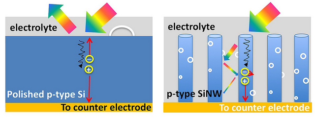 王德利的研究小組模仿這種結(jié)構(gòu),他們的“三維枝杈納米線陣列”(3D branched nanowire array)采用了一種工藝,稱為光電化學(xué)(photoelectrochemical)水解,可以產(chǎn)生氫氣。分解水所指的過(guò)程可以把水分離成氧和氫,提取氫氣作為燃料使用。這項(xiàng)工藝使用清潔能源,沒(méi)有溫室氣體副產(chǎn)品。相比之下,目前的傳統(tǒng)制氫方式依靠化石燃料供電。
