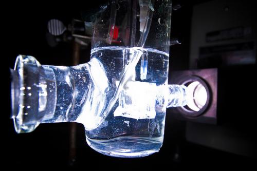 在這個(gè)實(shí)驗(yàn)中,納米樹(shù)電極浸在水中,用模擬太陽(yáng)光照亮,可測(cè)量設(shè)備的電力輸出。來(lái)源:加州大學(xué)。