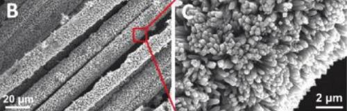 掃描電子顯微鏡(Scanning electron microscope)圖像顯示,二氧化鈦納米棒陣列均勻覆蓋碳纖維。來源:佐治亞理工學(xué)院