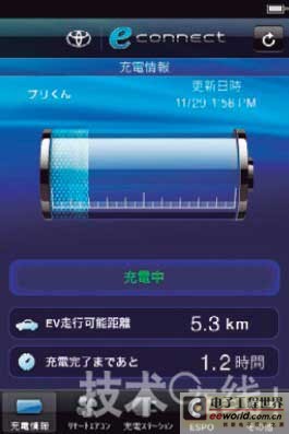 充電只支持普通充電,用AC200V電源約需90分鐘,用AC100V電源約需180分可充滿電。配備了可根據(jù)出發(fā)時(shí)間進(jìn)行充電和利用夜間電力充電的定時(shí)功能。此外,在所有車型上標(biāo)配了通過智能手機(jī)獲得電池剩余電量和充電站等信息的新服務(wù)“PHV駕駛支援”(圖4)。
