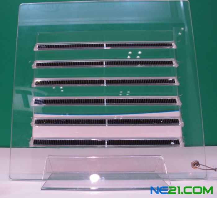 該太陽能電池模塊的制作原理是在棱鏡的一面粘貼太陽能電池單元,然后將其粘貼在透明的基板上。而此次采用的太陽能電池則是對其他公司的結(jié)晶硅型太陽能電池進行細致切割而成的。