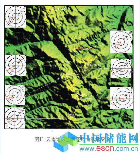 云貴高原常年西南季風(fēng),西部風(fēng)能資源好于東部。我國南方大部分地區(qū)氣候受青藏高原影響較大,冬季西風(fēng)氣流遭阻擋,分為南北兩支,形成北脊南槽的環(huán)流形勢;夏季,西南季風(fēng)向北推進(jìn)時(shí),受阻于青藏高原分為兩支,一支向西,另一支沿山脈走向,流向中國,擴(kuò)大西南季風(fēng)的影響范圍。故云貴地區(qū)風(fēng)向高度集中在SW、WSW,非常利于風(fēng)能資源的充分利用。圖11為云南地區(qū)主風(fēng)能風(fēng)向示意圖。