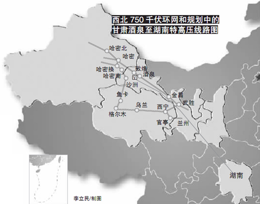 傅錚介紹:“目前,河西地區(qū)僅通過(guò)雙回750千伏和雙回330千伏線路電磁環(huán)網(wǎng)運(yùn)行,與主網(wǎng)聯(lián)系還較薄弱。其中,酒泉地區(qū)地處甘肅最西端,電網(wǎng)結(jié)構(gòu)相對(duì)薄弱,地區(qū)用電負(fù)荷水平低。”記者翻開(kāi)西北地區(qū)地圖看到,甘肅河西走廊長(zhǎng)約1200公里,地域有限,集中了西氣東輸、西油東送、鐵路、公路等運(yùn)輸通道,以及較密集的110千伏、330千伏、750千伏等輸電線,再加上正在建設(shè)的“疆電外送”特高壓等西電東送通道,河西走廊留給酒泉風(fēng)電基地的外送通道十分有限。