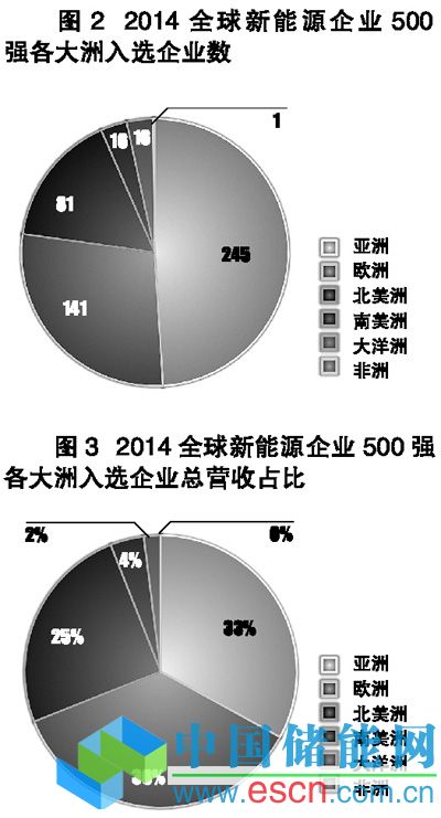 與上述現(xiàn)象相一致的是入選企業(yè)總營業(yè)收入規(guī)模的變化。2014全球新能源企業(yè)“500強”亞洲入選企業(yè)的總營收額為9219億元,占“500強”總營收額的33%(見圖3),比2013年的8643億元(占30.5%)增加了576億元;而2014歐洲入選企業(yè)的總營收額為1015億元,占“500強”總營收額的36%,比2013年的1037億元(占36.7%)減少了22億元。