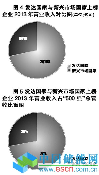 從上榜企業(yè)規(guī)模來看,“500強”企業(yè)2013年度營業(yè)總收入為28202億元,比2012年的28301億元略微減少了99億元。其中,發(fā)達國家上榜企業(yè)營業(yè)總收入為20183億元,比2012年的20833億元減少650億元(見圖4),約占 “500強”營業(yè)總收入的71.57%,(見圖5),比2012年的73.79%年減少了2.22個百分點;新興市場國家上榜企業(yè)總收入為8019億元,比2012年的7418億元增加了601億元,約占“500強”營業(yè)總收入的28.43%,比2012年的26.21%增加了2.22個百分點。