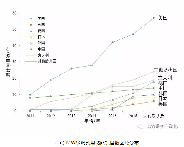 美國MW級儲能調(diào)頻項目數(shù)和裝機容量均以顯著優(yōu)勢領(lǐng)跑,意大利、德國、英國近幾年有較快發(fā)展趨勢,韓國和日本相關(guān)項目于2015~2016年受到重視,中國則每年以平穩(wěn)速度推進示范應(yīng)用。
