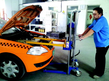 目前,電動出租車尚不能達(dá)到隨時充電的境界,因此只能最大限度地提高更換電池和充電的速度。為此,他們對電動出租車實(shí)行兩班制經(jīng)營,并按照1:2的比例,每輛電動出租車都配了2組電池,一組充滿電的電池代替耗沒電的電池組在道路上工作,而被替換下的電池則在固定的充電處,由專門人員負(fù)責(zé)充電并進(jìn)行維護(hù)、保養(yǎng)。