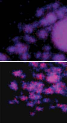 閃亮的殼:當(dāng)一個(gè)4納米的鉑銅合金納米粒(上)暴露在周期性的交流電中,銅原子從表面分離,生成一個(gè)富含鉑的殼。在掃描傳送式電子顯微鏡下,它的圖像更亮(下)。 來(lái)源:彼得•斯特拉瑟(Peter Strasser)