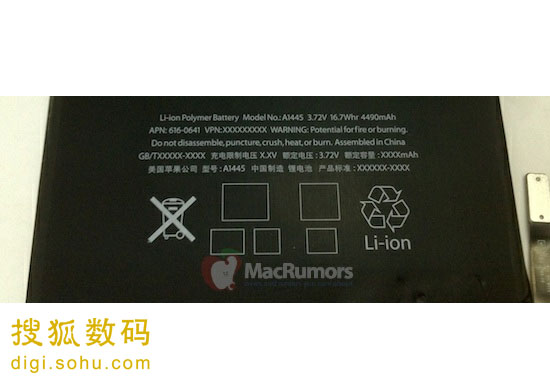 中國(guó)儲(chǔ)能網(wǎng)訊:10月16日消息。據(jù)國(guó)外媒體消息,蘋果將要在10月23日發(fā)布采用7.85英寸屏幕的 iPad mini。隨著內(nèi)部原件和外殼的泄漏照,甚至零售店的安排表,關(guān)于iPad mini的消息將變得更加真實(shí),并且MacRumors擁有一張電池的照片,照片上的內(nèi)容被認(rèn)為是iPad mini的電池。盡管MacRumors無(wú)法確認(rèn)照片的真實(shí)性,但照片表明iPad mini將可能采用參數(shù)為16.7Whr,3.72V的電池。
