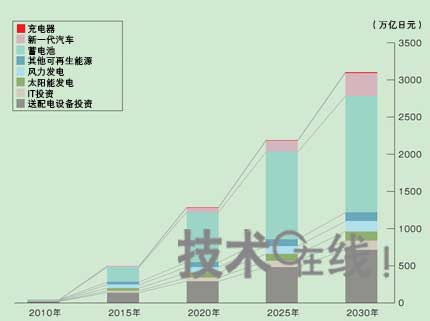 其中對(duì)制造業(yè)尤其具有吸引力的是能源領(lǐng)域。太陽(yáng)能發(fā)電等可再生能源和以電動(dòng)汽車(EV)為首的新一代汽車等低碳型產(chǎn)品將會(huì)大量導(dǎo)入。隨之而來(lái)的將是為確保系統(tǒng)電網(wǎng)穩(wěn)定的蓄電池和送配電網(wǎng)市場(chǎng)的擴(kuò)大。日經(jīng)BP社環(huán)境類智囊團(tuán)——日經(jīng)BP CleanTech Institute調(diào)查了100個(gè)主要的智能城市項(xiàng)目,基于此對(duì)蓄電池和新一代汽車等要素逐個(gè)進(jìn)行預(yù)測(cè)的結(jié)果表明,智能城市的市場(chǎng)規(guī)模在2030年累計(jì)將達(dá)3100萬(wàn)億日元(圖2)。