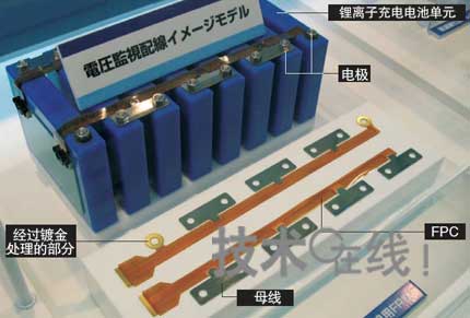 日本NOK展出的是嵌入鋰離子充電電池的柔性印刷底板(FPC)“電壓監(jiān)控布線用FPC”(圖3)。鋰離子充電電池由電池管理單元(BMU)對各電池單元的功能及安全性進(jìn)行管理。這種FPC是能夠用電信號將各個電池單元連接至BMU,并利用BMU檢測出電池單元電壓的部件。