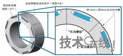 轉(zhuǎn)子為8極,轉(zhuǎn)子上插入了8個這種磁鐵。如果第1極沒有溝槽,則第3、5、7極也沒有溝槽,而在第2、4、6、8極設(shè)有溝槽。具體而言,就是在轉(zhuǎn)子外周上正好相當(dāng)于磁鐵兩端附近之處,加工深1mm×寬5mm左右的小溝槽。因此,各個“有溝槽極”上分別設(shè)有兩個溝槽。