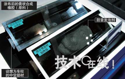 涂布的對象位置為車柱(A~C柱)內(nèi)部等。由于這些部位的截面為箱狀(中空),因此車輛行駛時會因風(fēng)灌入而產(chǎn)生風(fēng)切音。對此,可將防音發(fā)泡劑填入車柱內(nèi)部,通過切斷氣流來減小風(fēng)切音。此外,為了防止汽車產(chǎn)生路面噪聲、輪胎噪聲以及石子飛濺的聲音,盛勢達(dá)還考慮將這種發(fā)泡劑應(yīng)用于輪罩拱(Wheel Arch))及地板下方等。其隔音效果為30dB左右。