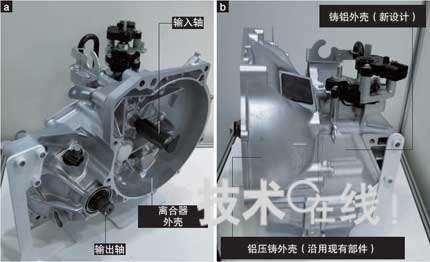 | 圖8:驅(qū)動用馬達(dá)減速機(jī)(富士機(jī)械) 已配備于斯巴魯Plugin Stella。屬于兩檔減速型,輸入軸與馬達(dá)軸連接。內(nèi)部有中間軸(照片上看不到),輸出軸與車輪端相連(a)。鋁壓鑄離合器殼體沿用了現(xiàn)有部件。殼體蓋為新制造,由模具費(fèi)用比鋁壓鑄品低的鋁鑄造品制成(b)。 |