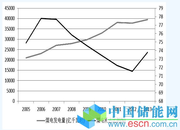 2013年,全國煤電投資及其裝機比重連續(xù)下降,全年完成煤電投資同比下降12.3%,占電源投資比重降至19.6%;年底裝機7.9億千瓦,占比降至63.0%、同比降低2.6個百分點;發(fā)電量39474億千萬時,同比增長6.7%,占比73.8%、同比降低0.6個百分點;全年設備利用5128小時。