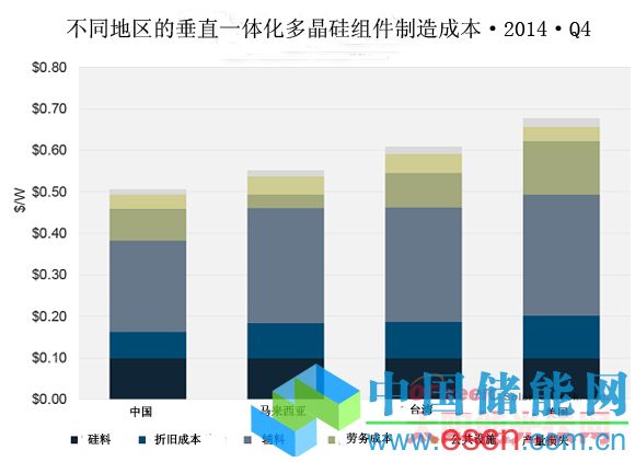 美國的多晶硅組件每瓦平均生產(chǎn)成本為0.68美元。不過,如果考慮到SolarWorld和SolarCity最近宣布的關(guān)于低成本制造的計劃,美國地區(qū)可能會出現(xiàn)一些有趣的變數(shù),值得關(guān)注。
