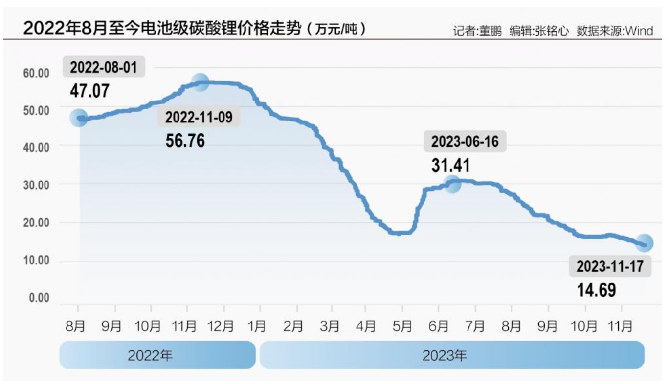 中國(guó)儲(chǔ)能網(wǎng)訊:近日,第三方市場(chǎng)機(jī)構(gòu)統(tǒng)計(jì)的碳酸鋰均價(jià)跌破15萬(wàn)元/噸,再次創(chuàng)下年內(nèi)新低。