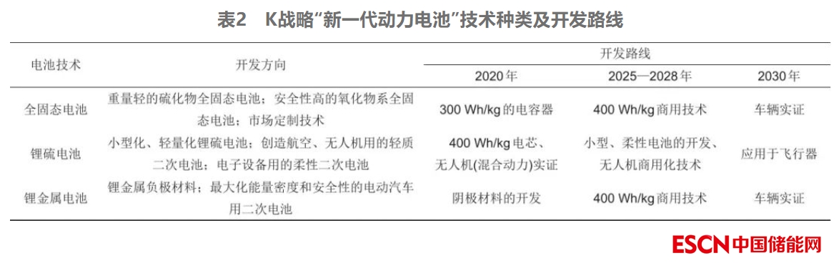 圍繞下一代動力電池技術(shù),韓國政府將拉動公私合作,支持大規(guī)模電池研發(fā)。K戰(zhàn)略中,韓國政府對研發(fā)路線進行了規(guī)劃,主要圍繞新一代電池制造技術(shù)以及實現(xiàn)全固態(tài)電池、鋰硫電池、鋰金屬電池的商用化,如表2所示。