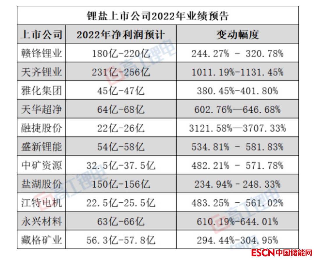 開年至今,鋰鹽上市公司陸續(xù)披露2022年業(yè)績預(yù)告,業(yè)績利潤及增速一家驚艷過一家。其中,融捷股份最高預(yù)增超37倍,天齊鋰業(yè)最高預(yù)增超過11倍;其余上市公司預(yù)增也均達到三位數(shù)。