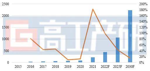 2015-2030年中國動力鋰電池出貨量及預測(單位:GWh,%)