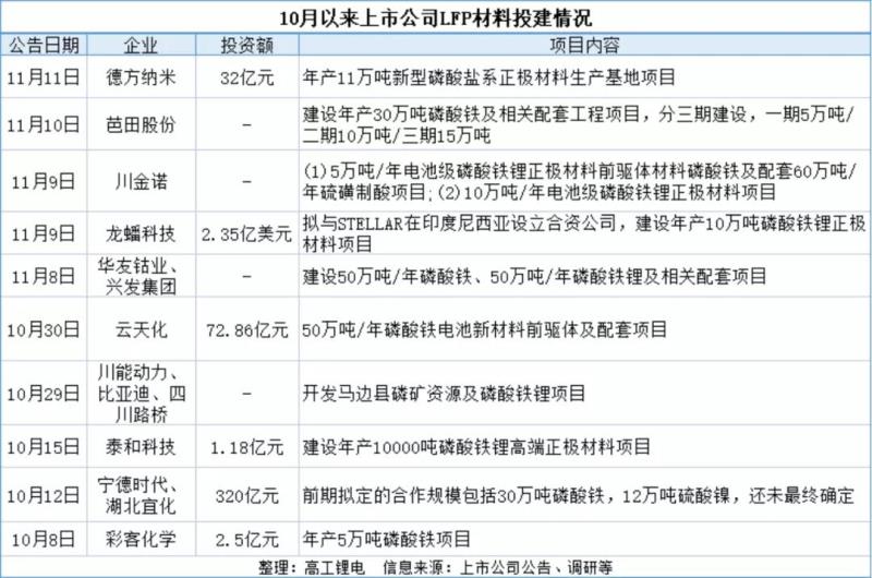 高工鋰電梳理統(tǒng)計(jì),10月以來,華友鈷業(yè)、云天化、芭田股份、川金諾等宣布投建磷酸鐵鋰相關(guān)項(xiàng)目,合計(jì)規(guī)劃磷酸鐵產(chǎn)能170萬噸,磷酸鐵鋰產(chǎn)能82萬噸。