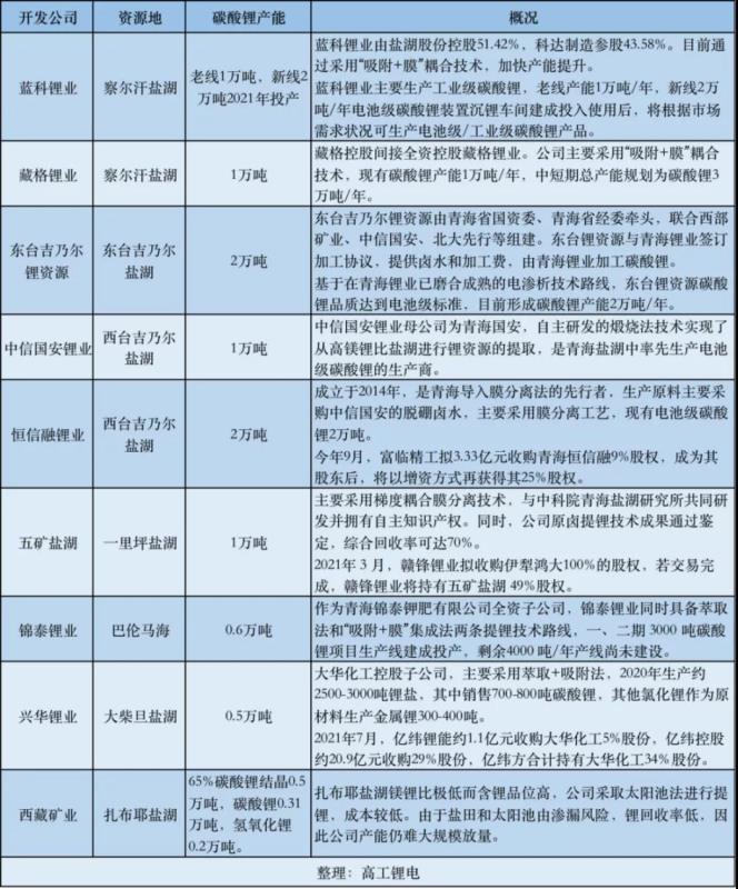 從國內鹽湖提鋰市場情況看,由于高原地區(qū)的生產(chǎn)環(huán)境惡劣、提取技術水平要求高、前期投入成本高,國內布局鹽湖提鋰規(guī)模化企業(yè)主要集中在藍科鋰業(yè)、藏格控股、東臺吉乃爾鋰資源/青海鋰業(yè)、恒信融鋰業(yè)、五礦鹽湖、錦泰鋰業(yè)、興華鋰業(yè)、西藏礦業(yè)等少數(shù)企業(yè)布局。