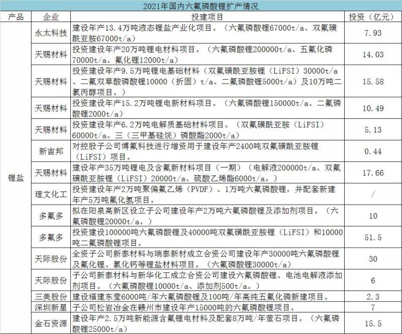 值得注意的是,盡管六氟磷酸鋰價(jià)格持續(xù)上漲但仍供不應(yīng)求,這為六氟磷酸鋰未來價(jià)格上行創(chuàng)造了支撐條件,進(jìn)而刺激六氟磷酸鋰廠家投資擴(kuò)產(chǎn)。
