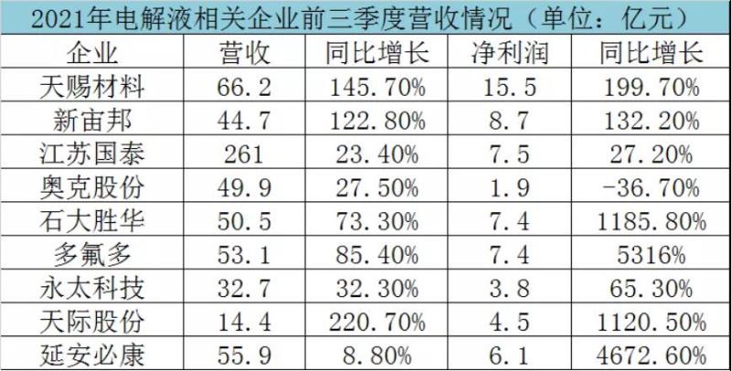 整體來看,受下游需求增長帶動(dòng)以及上游原材料漲價(jià),電解液產(chǎn)業(yè)鏈進(jìn)入高景氣度,產(chǎn)業(yè)鏈企業(yè)營收凈利同比大幅增長。從利潤增幅來看,添加劑和六氟磷酸鋰企業(yè)最高。