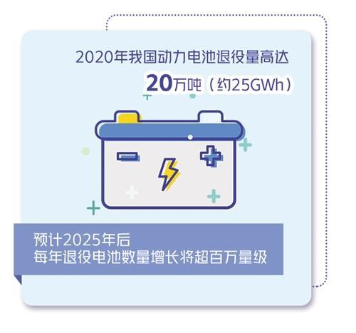 供需矛盾的加劇,引發(fā)產(chǎn)業(yè)鏈上下游對動力電池回收的關注。根據(jù)國家規(guī)定,動力電池容量衰減至額定容量的80%以下,就要面臨退役、被強制回收,而最早一批新能源汽車配備的動力電池已處于退役期。2020年我國動力電池退役量高達20萬噸(約25GWh),預計2025年后,每年退役電池數(shù)量增長將超百萬量級。電池的回收利用將成為一片新的藍海市場。