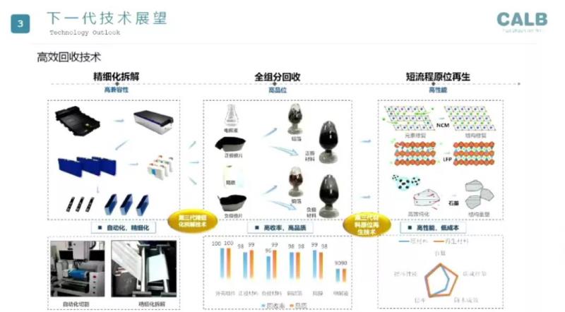 謝秋認(rèn)為,目前回收技術(shù)算是第三代技術(shù),一代很野蠻暴力的燒;第二代是破碎,把電池丟進(jìn)去;第三代,中航鋰電希望做精細(xì)化、自動化拆解,將銅箔、鋁箔、正極、負(fù)極材料完整地分離出來,這樣效率上會高很多,然后進(jìn)行短流程的原位再生。